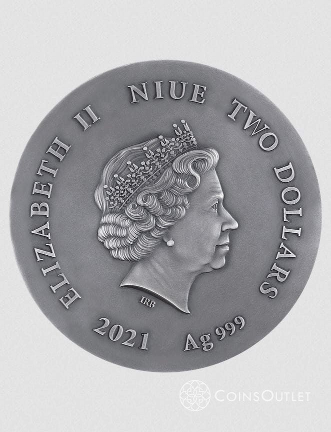 Ta srebrna moneta została wybita z dwóch uncji czystego srebra. Dodatkowo poddano ją oksydowaniu, aby wydobyć jej antyczne wykończenie. Rewers monety przedstawia wizerunek atakującego Zeusa w ręku trzymającego pioruny. Awers jest niezmienny w całej serii - to wizerunek królowej Elżbiety II z greckim wzorem.